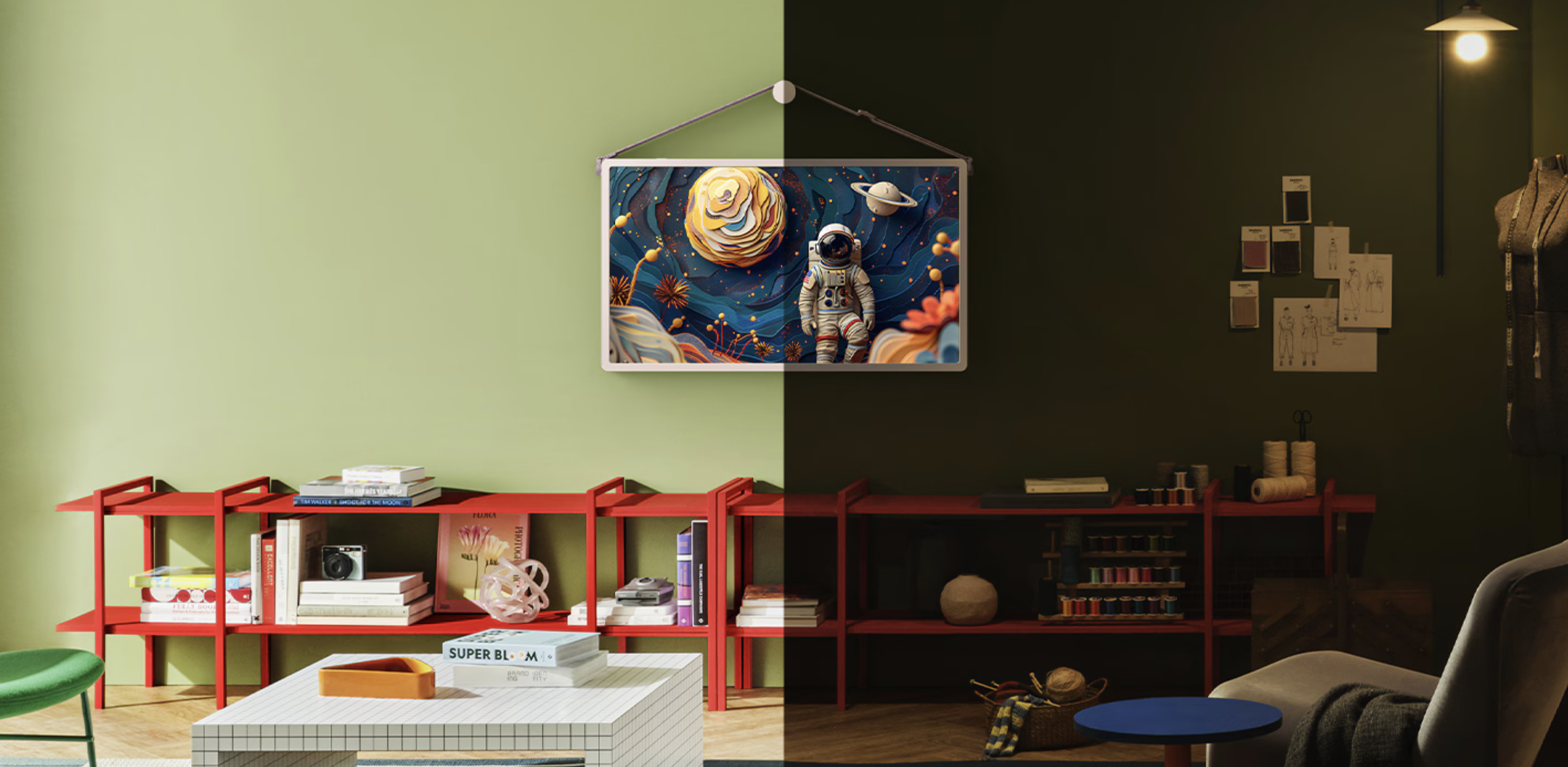 Mood Maker dodá prostoru atmosféru prostřednictvím pohyblivého umění Ukažte svůj styl pomocí tematických vizuálů, jako jsou hodiny, aktuální počasí, retro gramofon a mnoho dalších. Zobrazte své oblíbené motivy na obrazovce, která může sloužit také jako digitální fotorámeček.