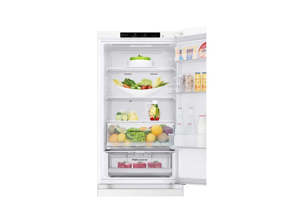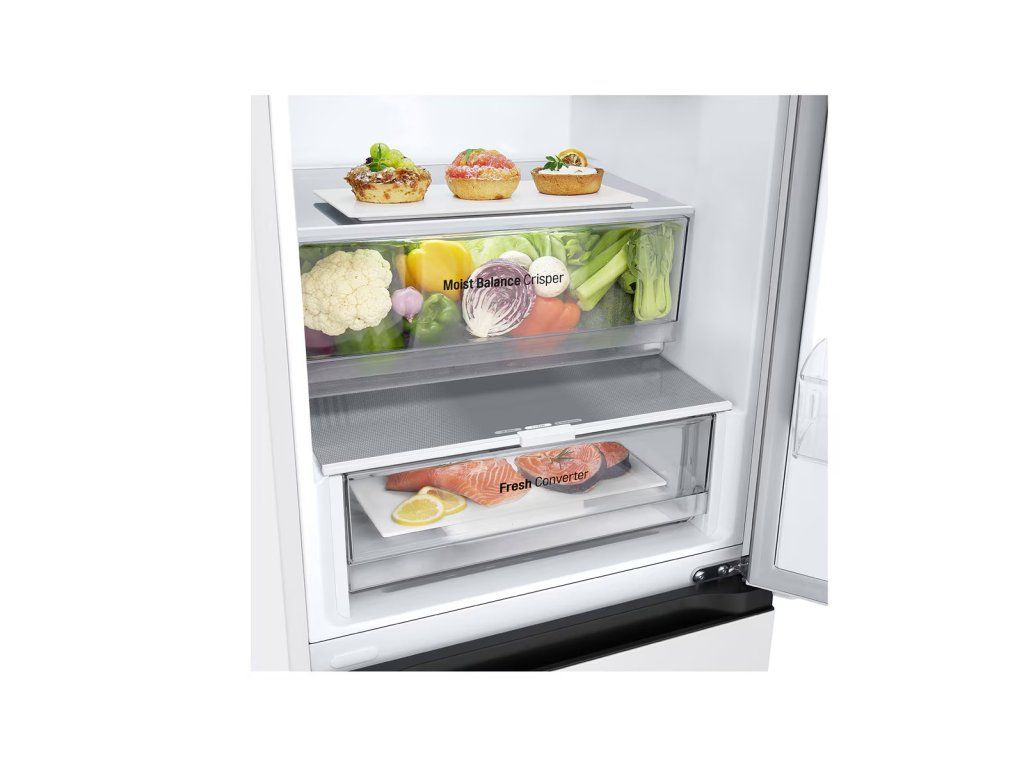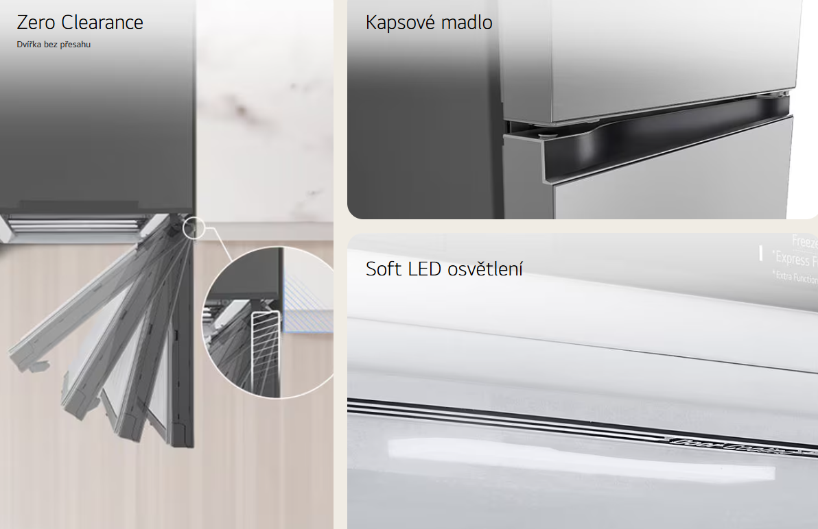 • LED osvětlení • 3x průhledná dveřní přihrádka • 2x police z tvrzeného skla • 3x průhledná mrazicí zásuvka • 2x box na zeleninu •