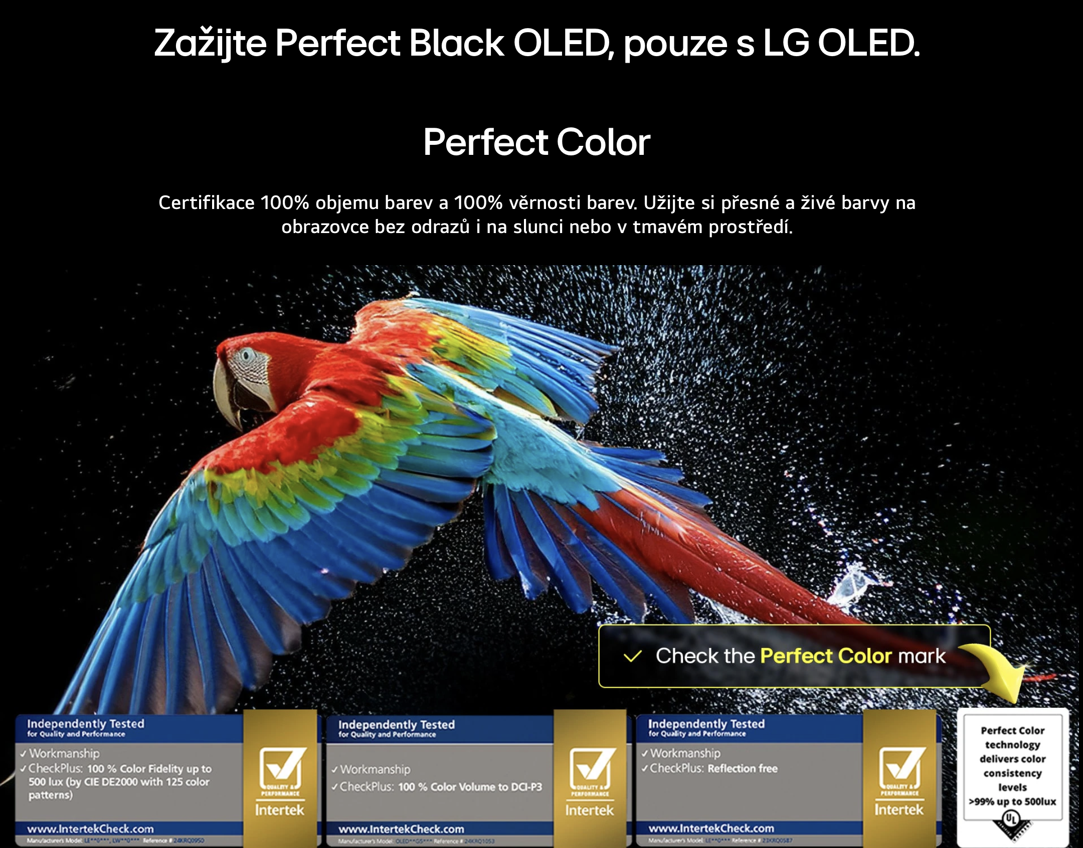 * Displej LG OLED má certifikaci UL pro dokonale černou barvu podle norem IDMS 11.5 Ring-light Reflection (odraz kruhového světla) na základě typického vnitřního osvětlení (200 luxů až 500 luxů).
