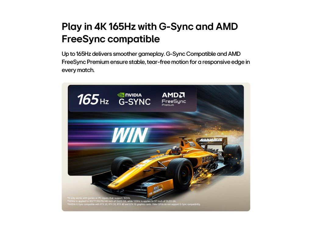 Úhlopříčka 65" (164 cm), 5 LET záruka na panel, design Gallery, 165Hz Obnovovací frekvence panelu, 4K ULTRA HD rozlišení (3840x2160), TV je určena na stolek, Stojan součástí balení, Procesor α11 4K AI Gen3, LG Shield - pokročilá ochrana dat, Dolby Atmos, Dolby Vision, AI zvuk - α11 AI Sound Pro, Pixel Dimming, Hudební výkon: 4.2 k 60 W, WOW Orchestra, WebOS Smart TV, Apple AirPlay 2 a HomeKit, Magický ovladač MR26
