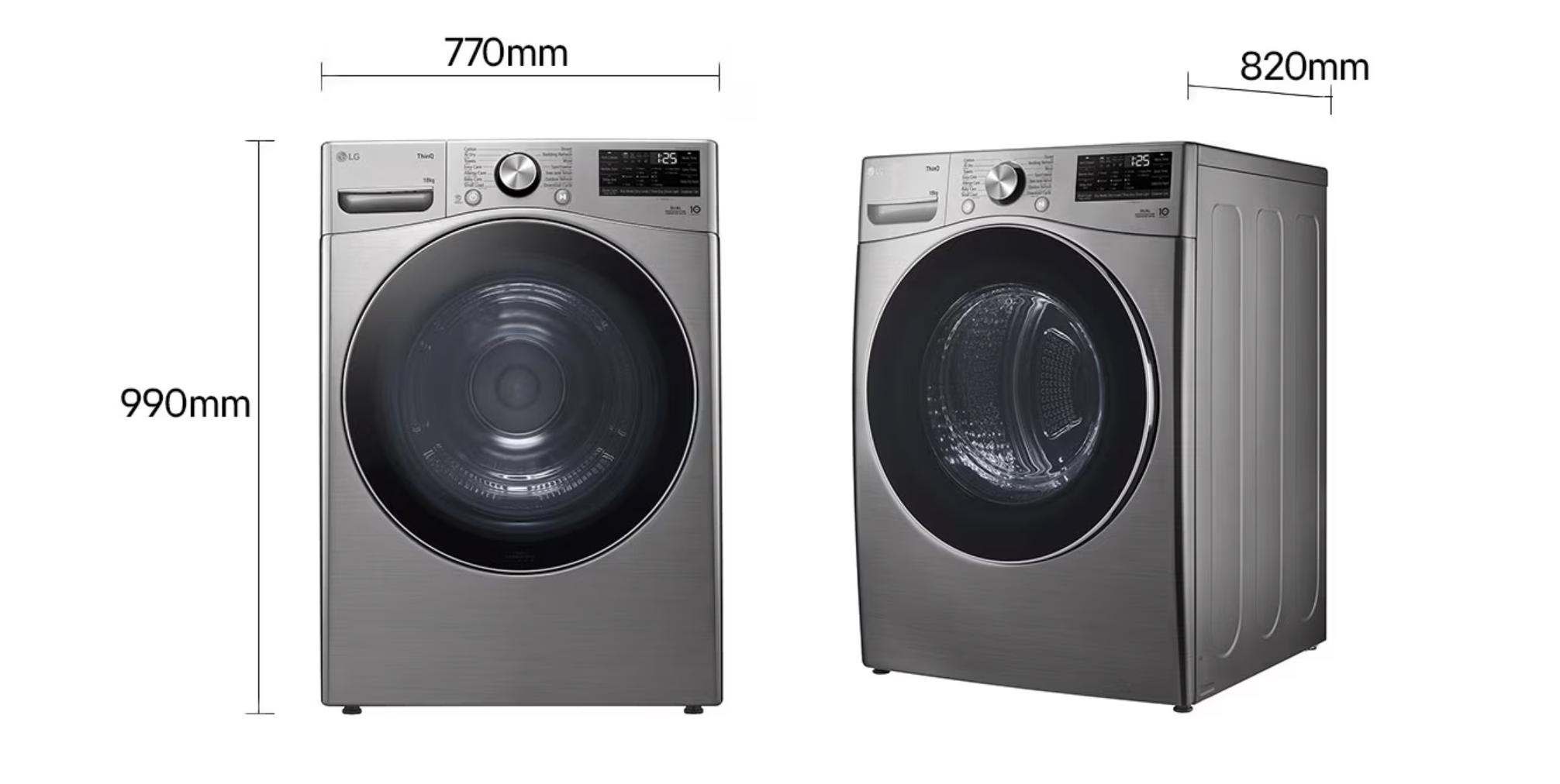 XXL Kapacita sušení: 18 kg, Duální invertorové tepelné čerpadlo, Automatické čištění kondenzátoru až 3x během cyklu, Perfect Dry a 3D Scan, Redukce až 99,9 % alergenů, 178 kWh / 100 cyklů, Vnitřní osvětlení, LG ThinQ + Wi-Fi pro vzdálené ovládání, Rozměry: (š x h x v) 700 x 820 x 990 mm