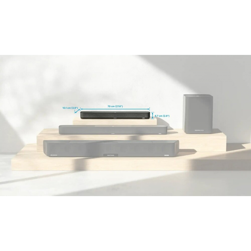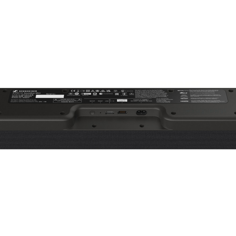 Virtualizační technologie AMBEO, vyvinutá ve spolupráci s Fraunhoferovým institutem IIS, poskytuje 3D poslechový zážitek prostřednictvím virtuálně generovaných reprosoustav. AMBEO Soundbar Mini obsahuje 6 reproduktorů směrovaných tak, aby v rámci promítání filmů jste byli pohlceni reálným 3D prostorovým zvukem. 70 centimetrů široký soundbar umístěný pod televizorem je schopen pomocí směrových reproduktorů a odrazem zvukových vln od stěn a stropu vytvořit prostorový zvuk vycházející zcela přesvědčivě z míst, kde nejsou žádné další reprosoustavy. Díky audiofilským zkušenostem společnosti Sennheiser je AMBEO Mini ideální i pro velmi kvalitní a efektní poslech hudby ve stereu nebo 5.1 upmixu. Akustice poslechové místnosti se AMBEO Mini automaticky přizpůsobí pomocí sofistikované kalibrace s vestavěnými mikrofony. Implementovaná, funkčně bohatá, ale uživatelsky vstřícná a intuitivní aplikace pomáhá ovládat manuální nastavení, ekvalizér, úpravu zvuku pro ideální porozumění hlasu a další funkce. AMBEO|OS podporuje hlavní streamovací služby: Google Chromecast, Apple AirPlay 2; Spotify Connect, Tidal Connect i oblíbenou pomocnici ALEXA.