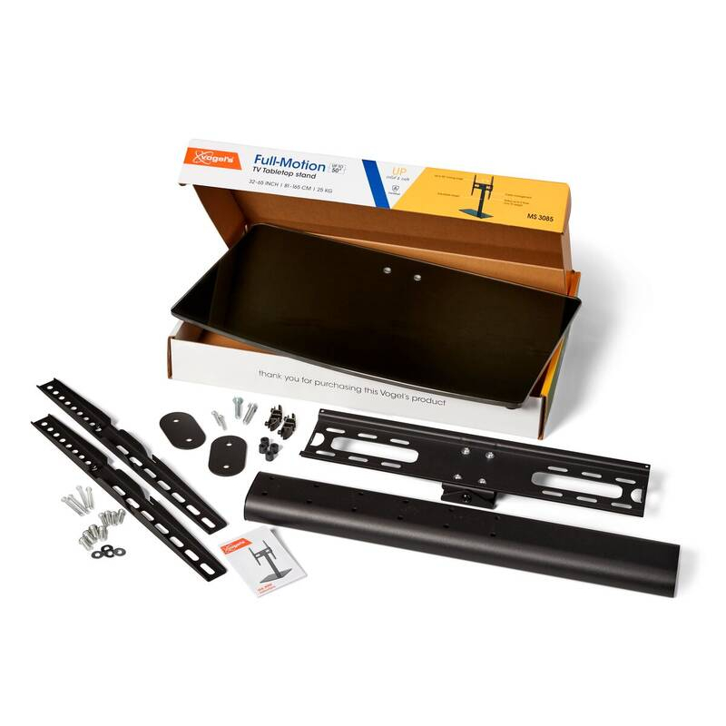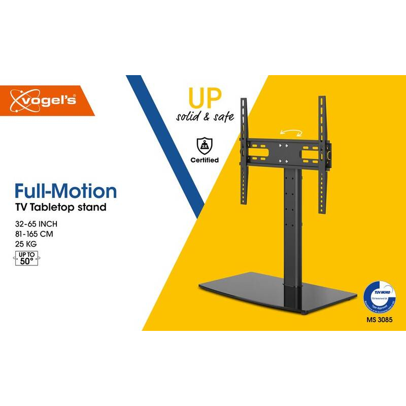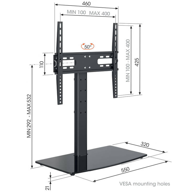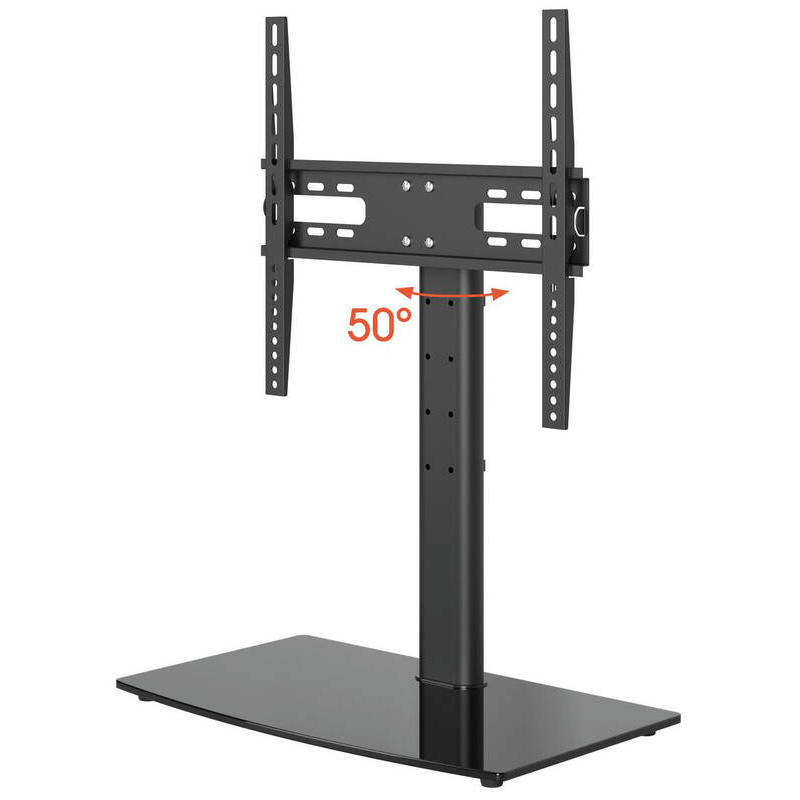 Tento robustní stojan na televizor přináší řešení, které vaší domácnosti dodá moderní a elegantní vzhled bez nutnosti vrtání do stěny. Vhodný je pro televizory s úhlopříčkou od 32 do 65 palců a nosností až 25 kg. Pro umístění stojanu nepotřebujete širokou televizní skříňku – základová deska o rozměrech 55 × 32 cm z tvrzeného skla zajišťuje mimořádnou stabilitu vašeho televizoru. Výšku montáže si můžete přizpůsobit podle svých potřeb a natočit obrazovku až o 50°