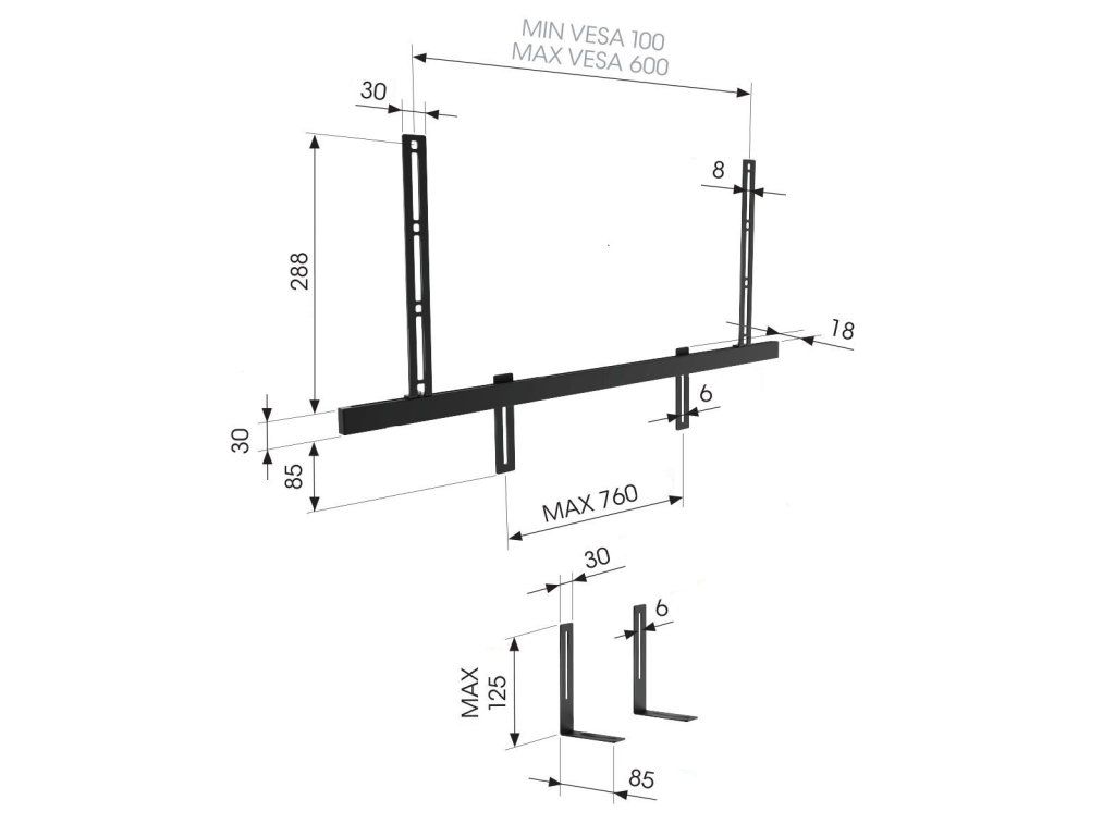 Držák je snadno nastavitelný pro soundbary různých velikostí i tvarů, ať už mají montážní otvory na zadní nebo spodní straně. Kombinace kvalitní oceli a hliníku s prémiovou povrchovou úpravou zajišťuje vysokou pevnost a dlouhou životnost.